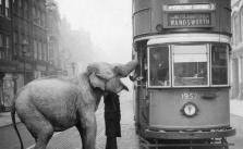 An Elephant stops a tram on Gray’s Inn Road, London, to eat an apple from the driver. 1936